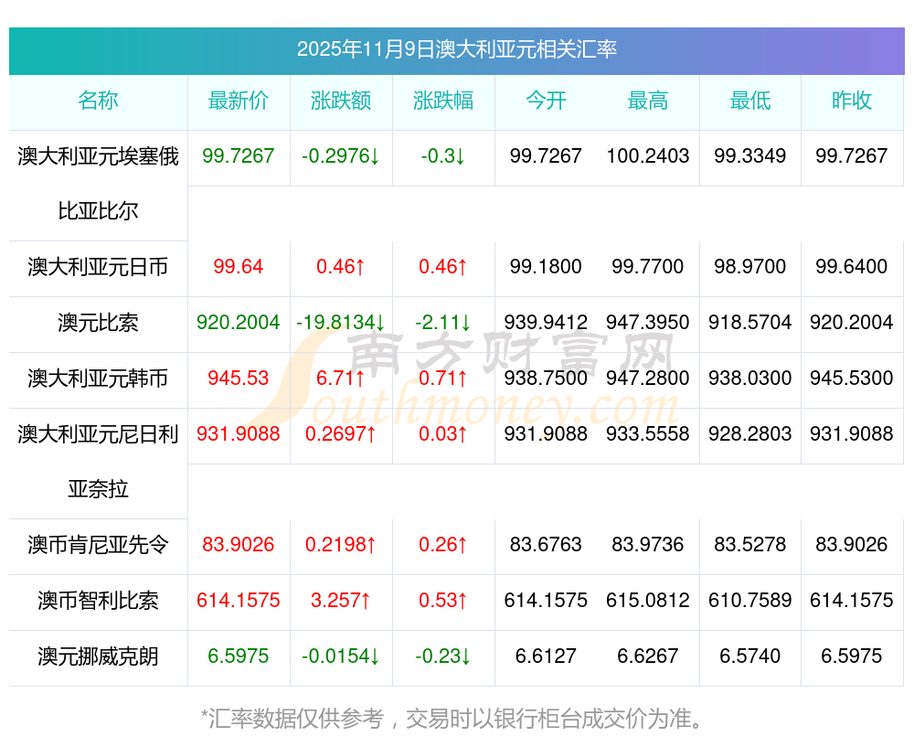 2025年11月9日澳大利亞元相關(guān)匯率查詢