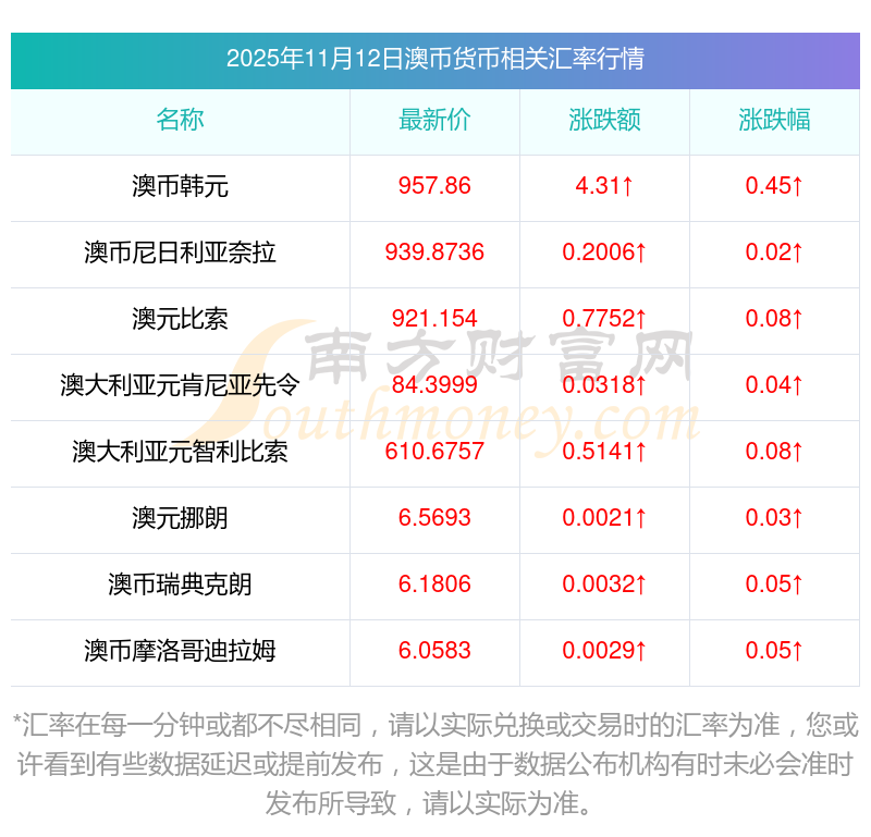 根據(jù)2025年11月12日匯率,澳幣兌換比索匯率最新11.957300,今開11.9607,昨收11.9581,最高11.9726,最低11.9419。