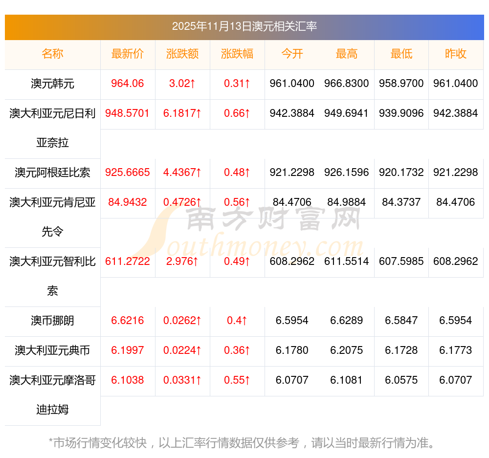 2025年11月13日澳元相關(guān)匯率查詢