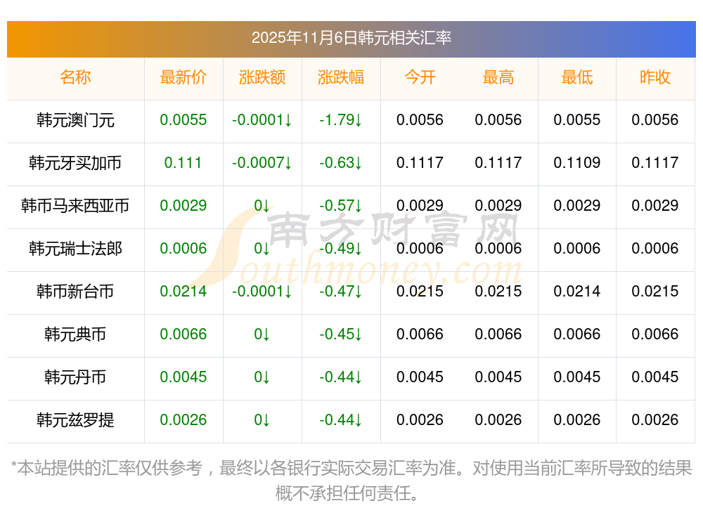 2025年11月6日韓元相關(guān)匯率查詢