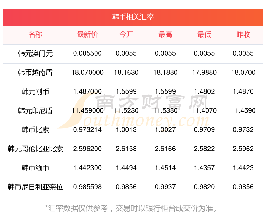 根據(jù)2025年11月8日匯率計算,KRW兌換NGN匯率最新價0.985598,今開價0.9856,昨收價0.9856,最高價0.9937,最低價0.9820。