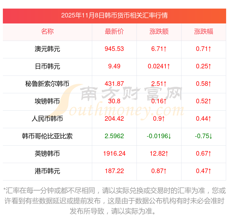 2025年11月8日最新消息,韓幣兌換墨幣最新匯率為0.012676,今開為0.0127,昨收為0.0127,最高為0.0128,最低為0.0126。