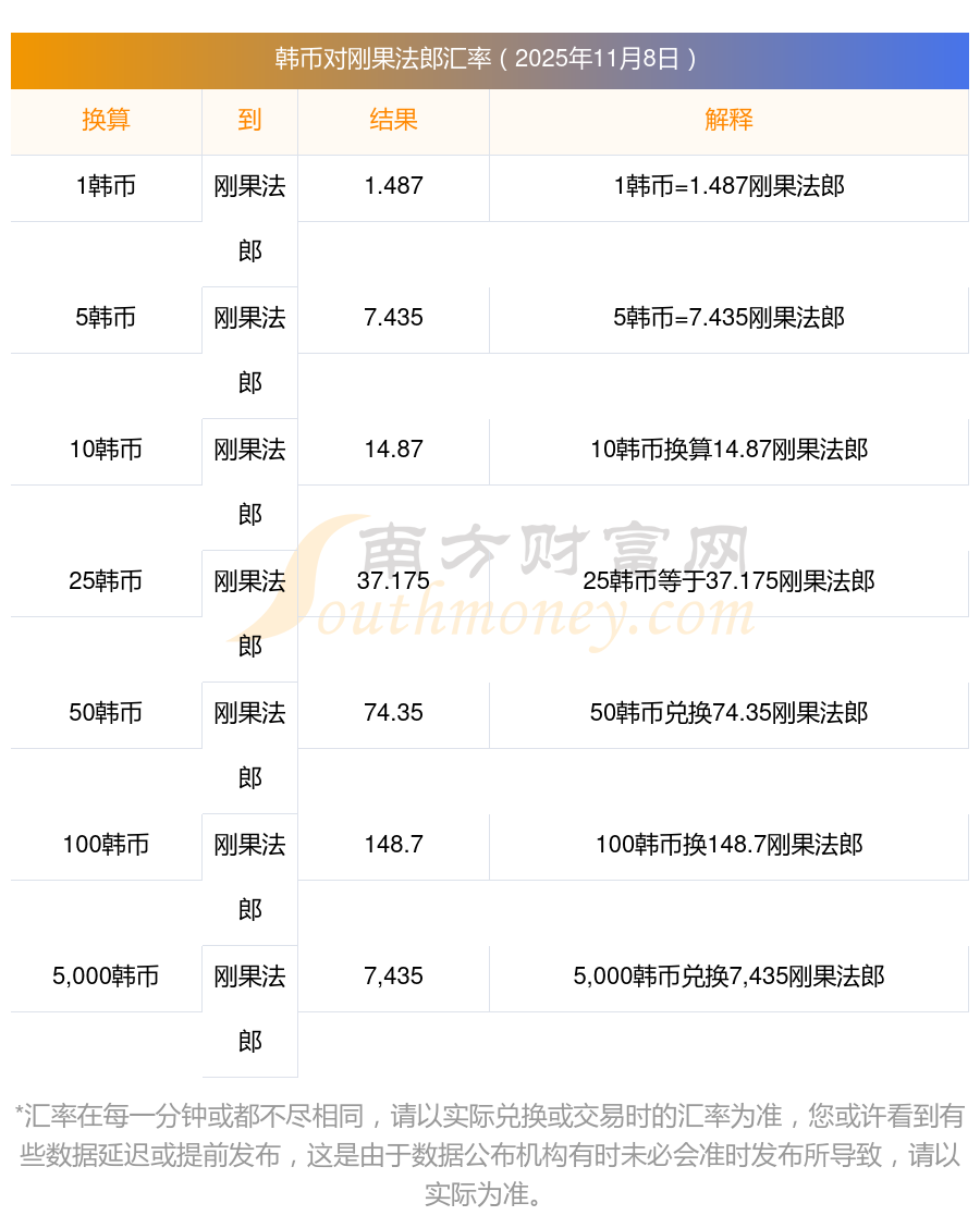 今天匯率更新!2025年11月8日99韓幣兌換剛果法郎是多少?
