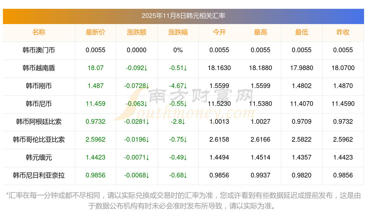 根據(jù)2025年11月8日匯率,韓元兌換埃塞俄比亞比爾匯率最新價0.105470,今開價0.1055,昨收價0.1055,最高價0.1067,最低價0.1050。