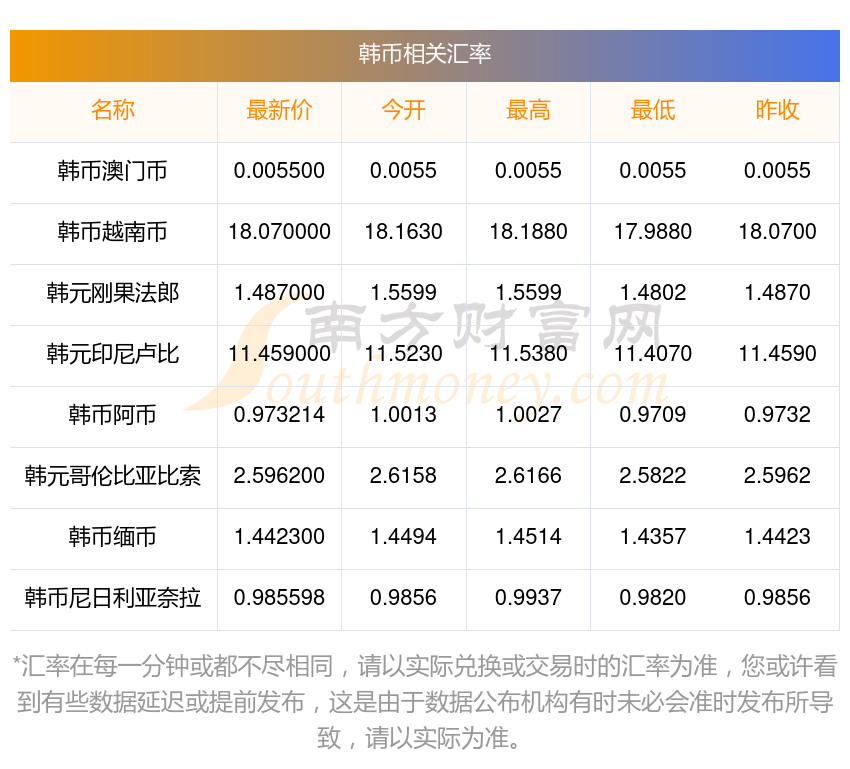 南方財富網(wǎng)為您提供韓幣對緬幣匯率最新價格詳情。