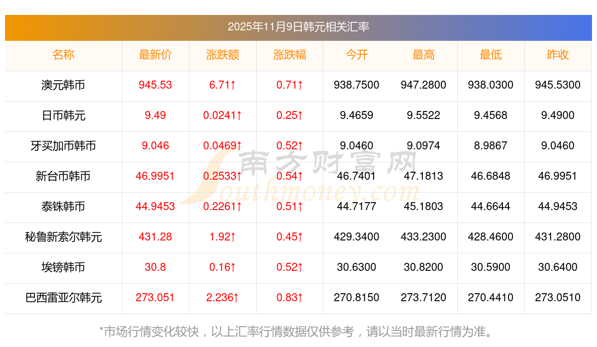 2025年11月9日最新消息,韓元兌換智利比索最新匯率為0.649540,今開為0.6495,昨收為0.6495,最高為0.6528,最低為0.6459。