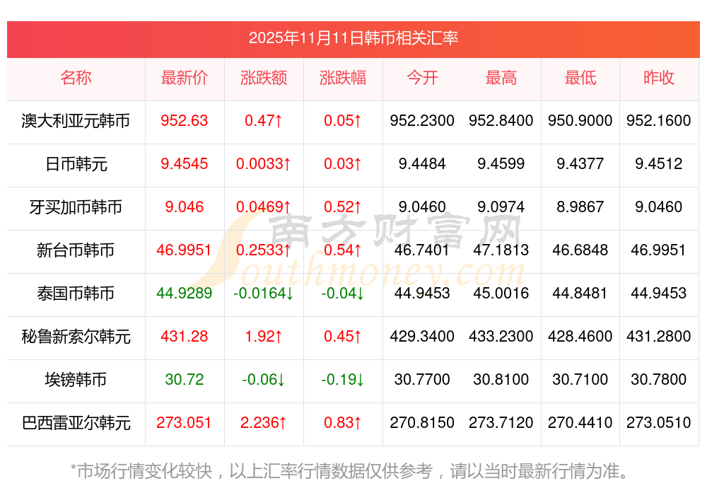 根據(jù)今天2025年11月11日匯率計(jì)算,KRW兌換CAD匯率最新價(jià)0.000961,今開(kāi)價(jià)0.0010,昨收價(jià)0.0010,最高價(jià)0.0010,最低價(jià)0.0010。