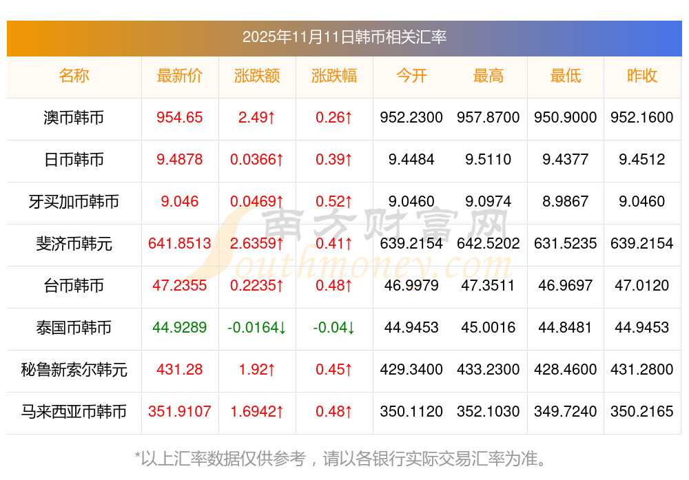 2025年11月11日韓幣相關匯率查詢