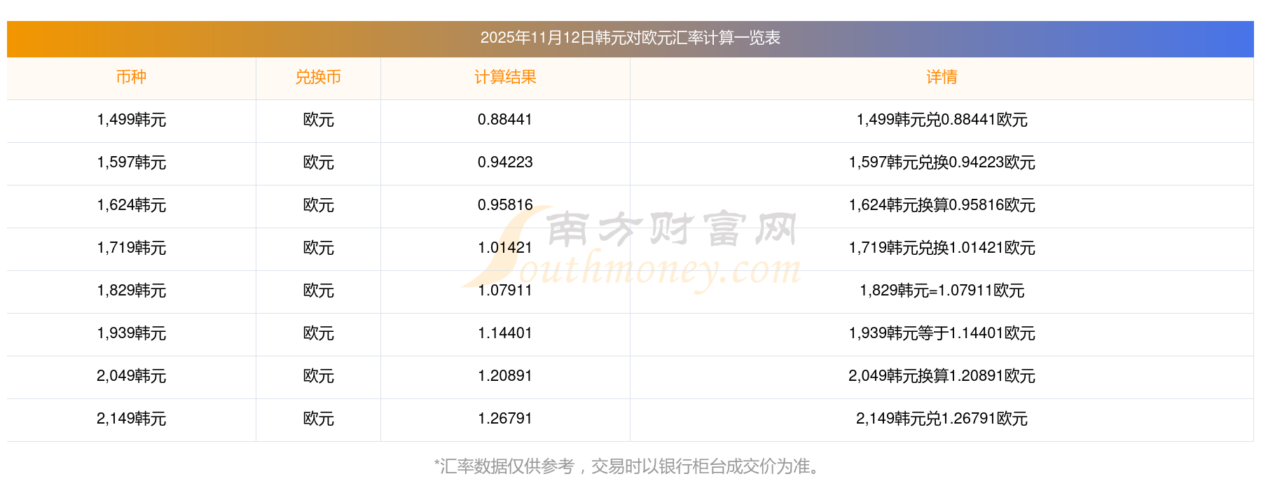 今日韓元與歐元結(jié)匯多少?韓元對(duì)歐元報(bào)價(jià)查詢2025/11/12