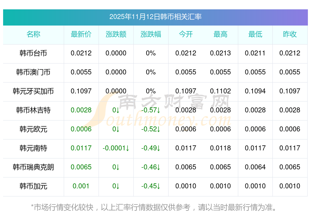 2025年11月12日韓幣相關匯率查詢