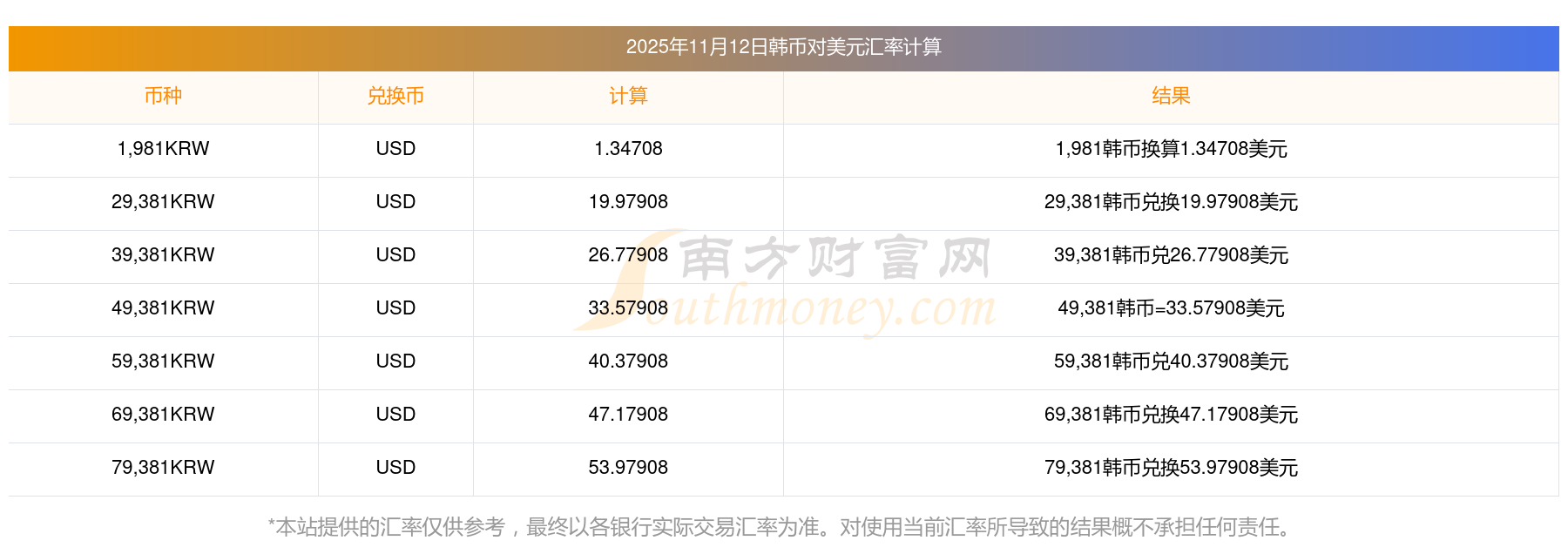 南方財富網為您提供韓幣對美元匯率最新價格詳情。