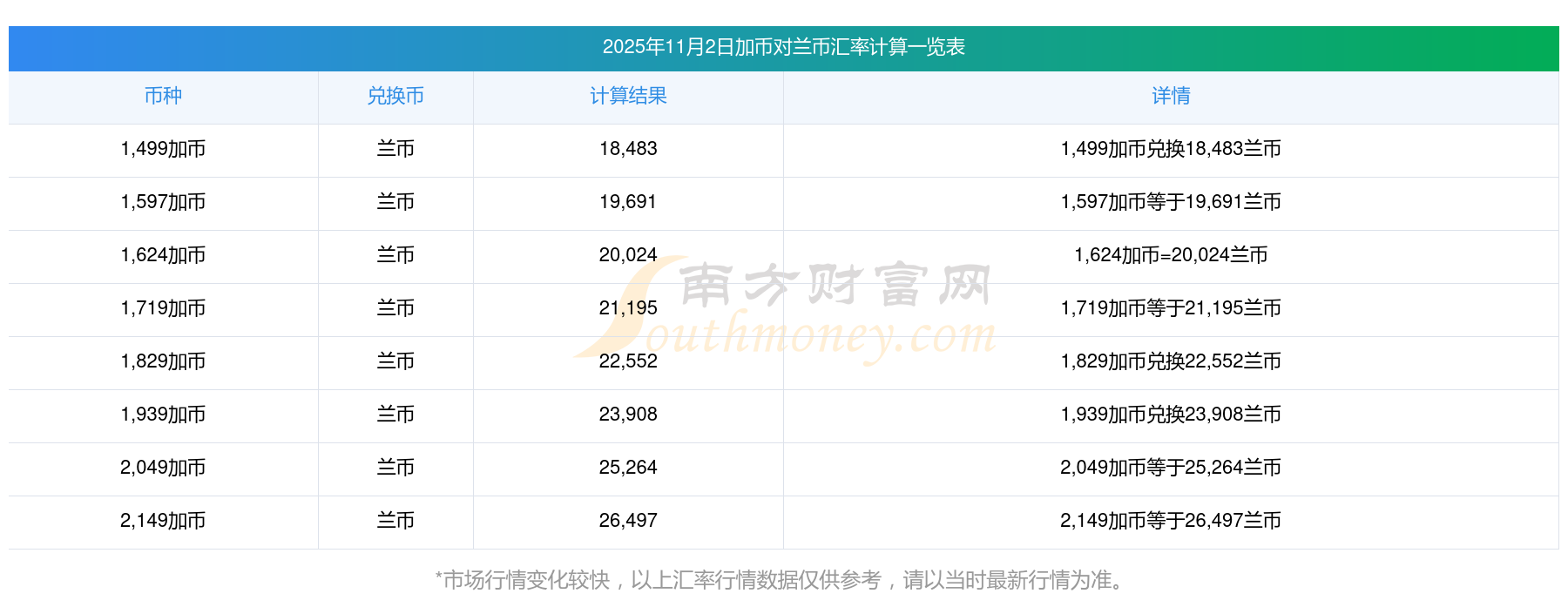 加幣對(duì)蘭幣匯率今日怎么樣 |匯率查詢 2025-11-02