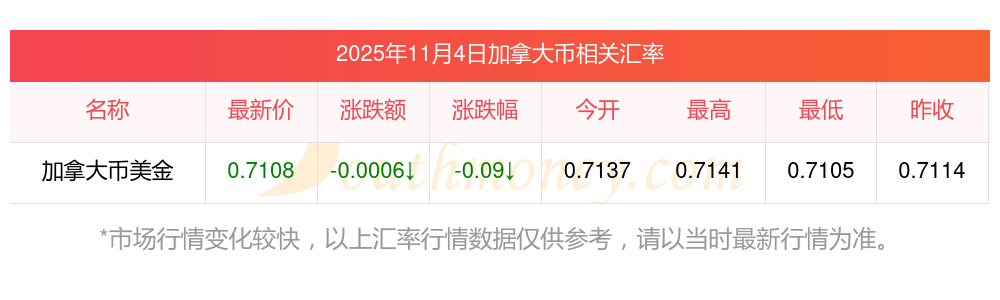 根據(jù)2025年11月4日匯率計算,CAD兌換USD匯率最新價0.710833:今開價0.7137,昨收價0.7114,最高價0.7141,最低價0.7105。