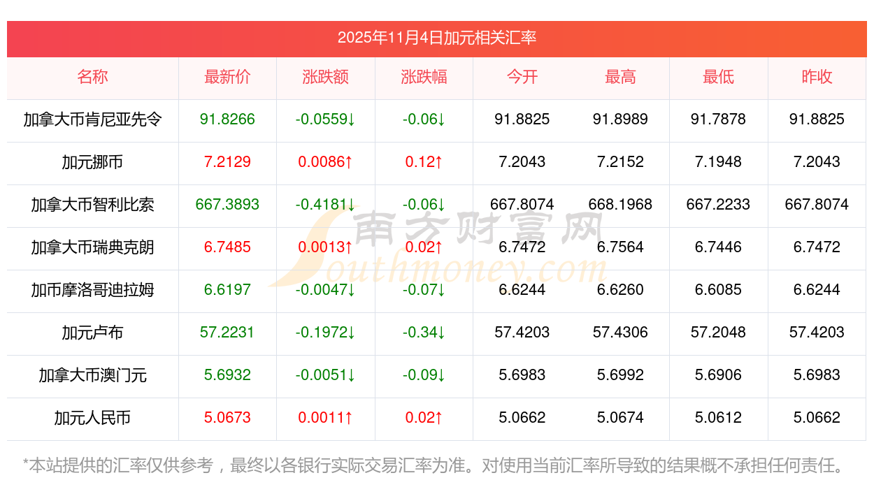 根據(jù)2025年11月4日匯率計(jì)算,CAD兌換NOK匯率最新價(jià)7.212900:今開(kāi)價(jià)7.2043,昨收價(jià)7.2043,最高價(jià)7.2152,最低價(jià)7.1948。
