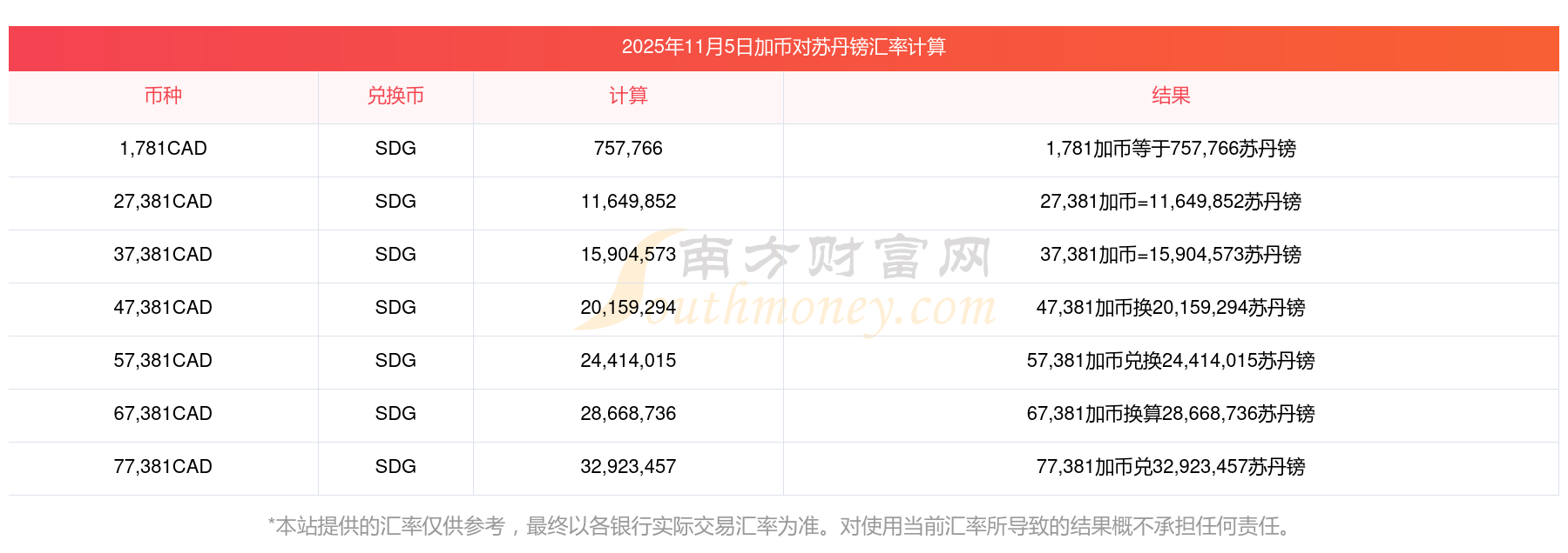 匯率實(shí)時(shí)更新!60加幣兌換蘇丹鎊匯率表(2025年11月5日)