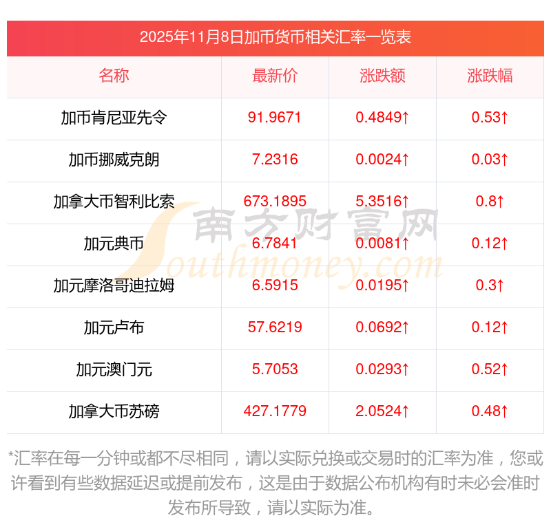 根據(jù)2025年11月8日匯率,加幣兌換緬元匯率最新價1494.822000,今開價1487.6746,昨收價1494.8220,最高價1497.0595,最低價1486.5680。