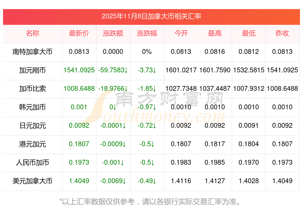 根據(jù)2025年11月8日匯率,加拿大幣兌換馬幣匯率最新2.972600,今開2.9634,昨收2.9726,最高2.9771,最低2.9539。