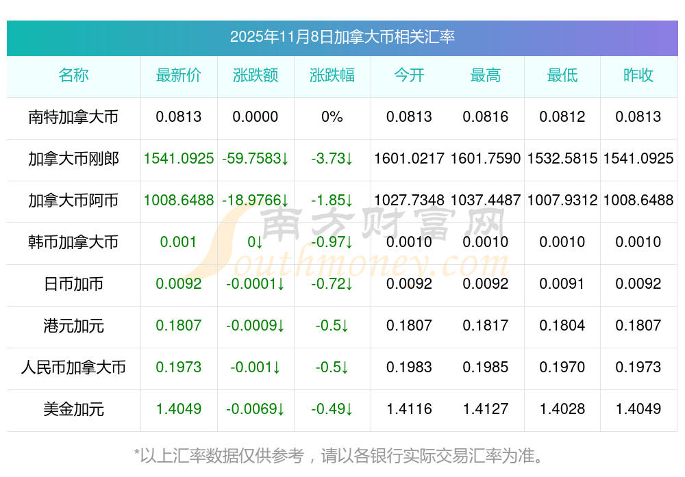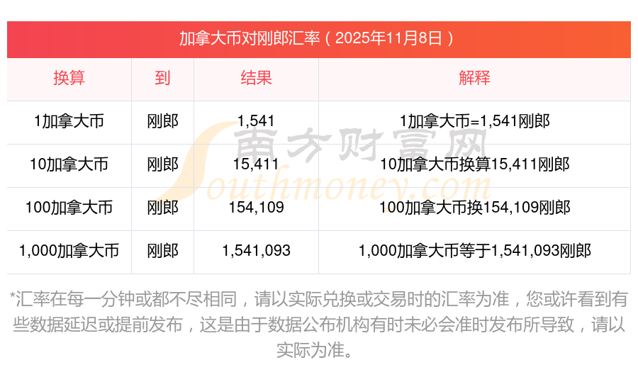 今日匯率表查詢 加拿大幣兌剛郎是多少11月8日
