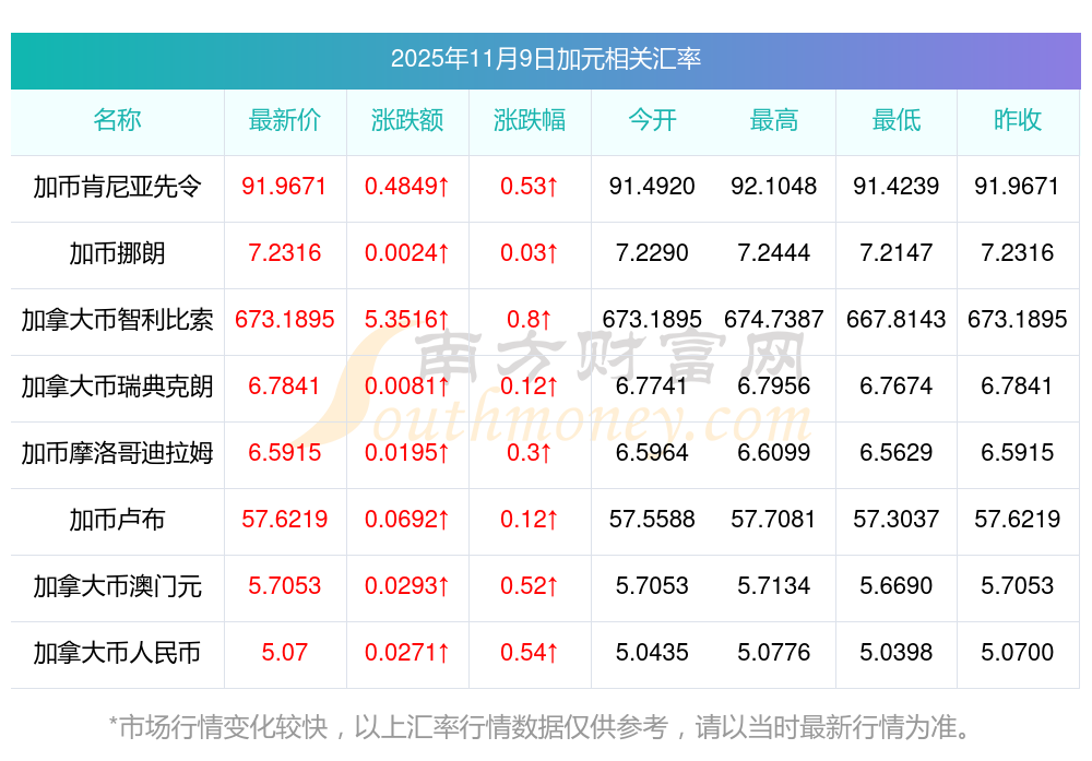 2025年11月9日加元兌換捷克幣最新匯率:14.955000,今開:14.9550,昨收:14.9550,最高:14.9797,最低:14.9077。