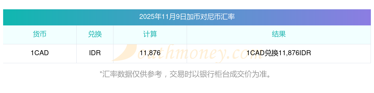 加幣匯率表:2025年11月9日10加幣等于多少尼幣?