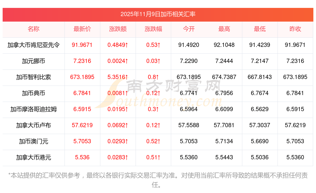 2025年11月9日加幣相關匯率查詢