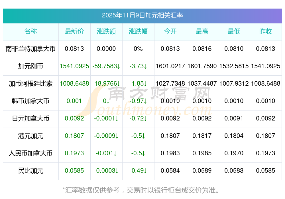 2025年11月9日最新消息,加元兌換剛幣最新匯率為1541.092500,今開為1601.0217,昨收為1541.0925,最高為1601.7590,最低為1532.5815。