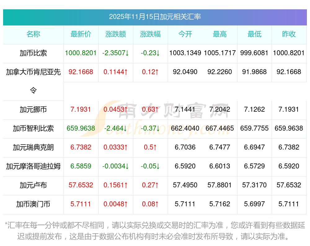 2025年11月15日加元相關(guān)匯率查詢