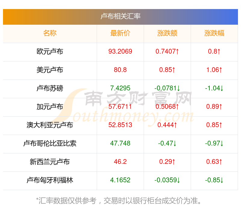 2025年11月1日盧布兌換埃鎊最新匯率:0.584700,今開:0.5874,昨收:0.5847,最高:0.5904,最低:0.5836。