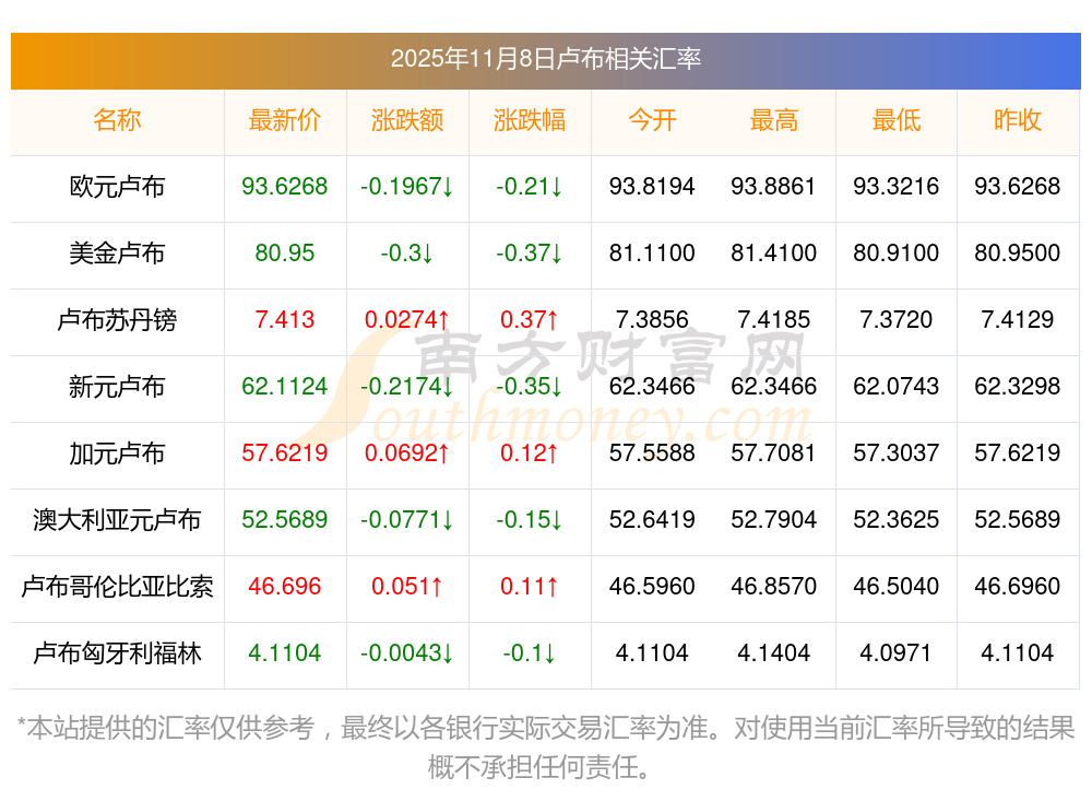 根據(jù)2025年11月8日匯率,盧布兌換哥倫比亞比索匯率最新價46.696000,今開價46.5960,昨收價46.6960,最高價46.8570,最低價46.5040。