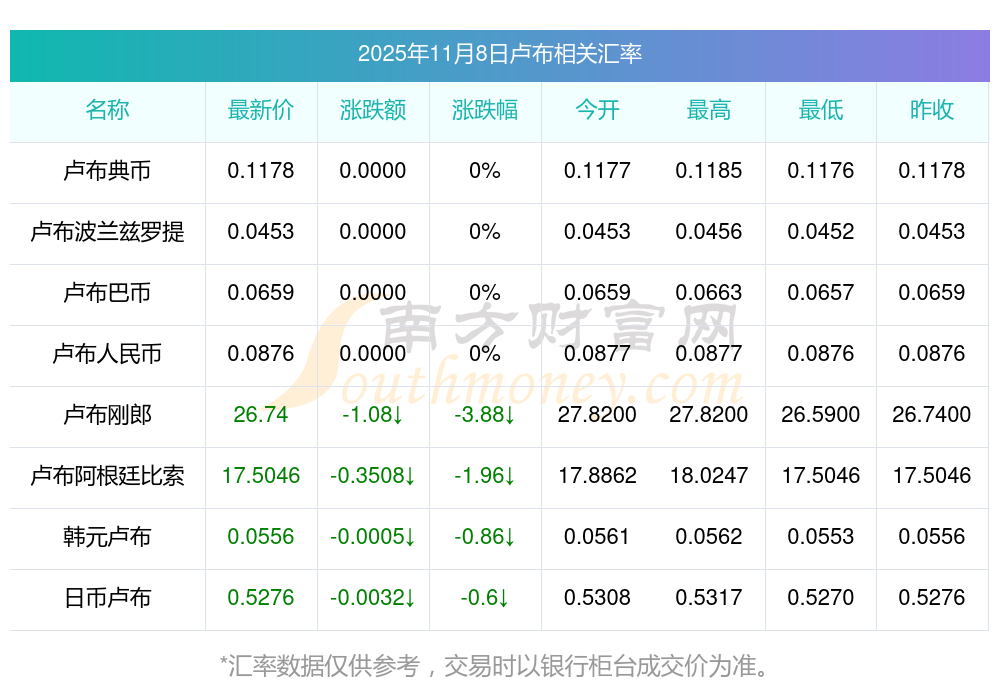 2025年11月8日盧布相關匯率查詢
