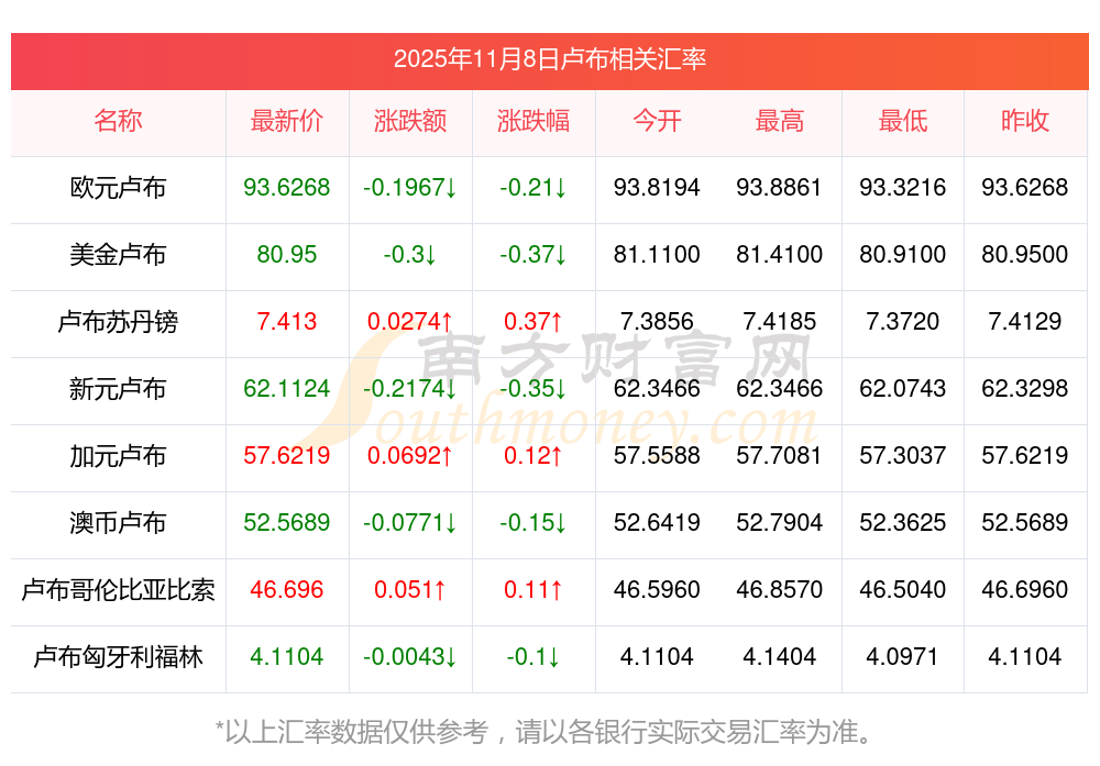 根據(jù)2025年11月8日匯率計(jì)算,RUB兌換PHP匯率最新價(jià)0.728400,今開價(jià)0.7270,昨收價(jià)0.7284,最高價(jià)0.7314,最低價(jià)0.7254。