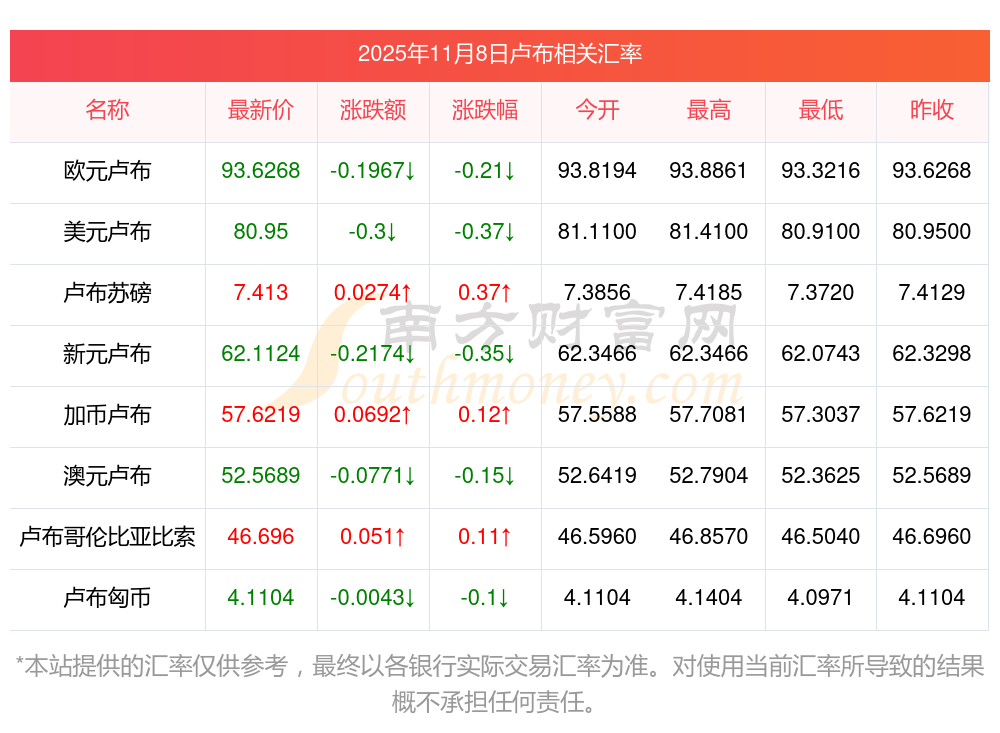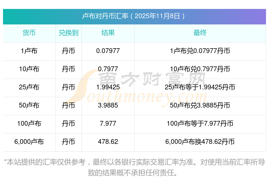 8兌換 | 今天盧布兌換為丹幣是多少? 2025年11月8日