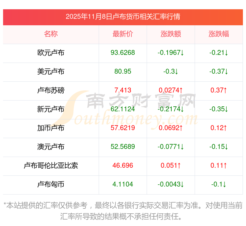 根據(jù)2025年11月8日匯率,盧布兌換緬幣匯率最新價25.942000,今開價25.8908,昨收價25.9420,最高價25.9548,最低價25.7954。