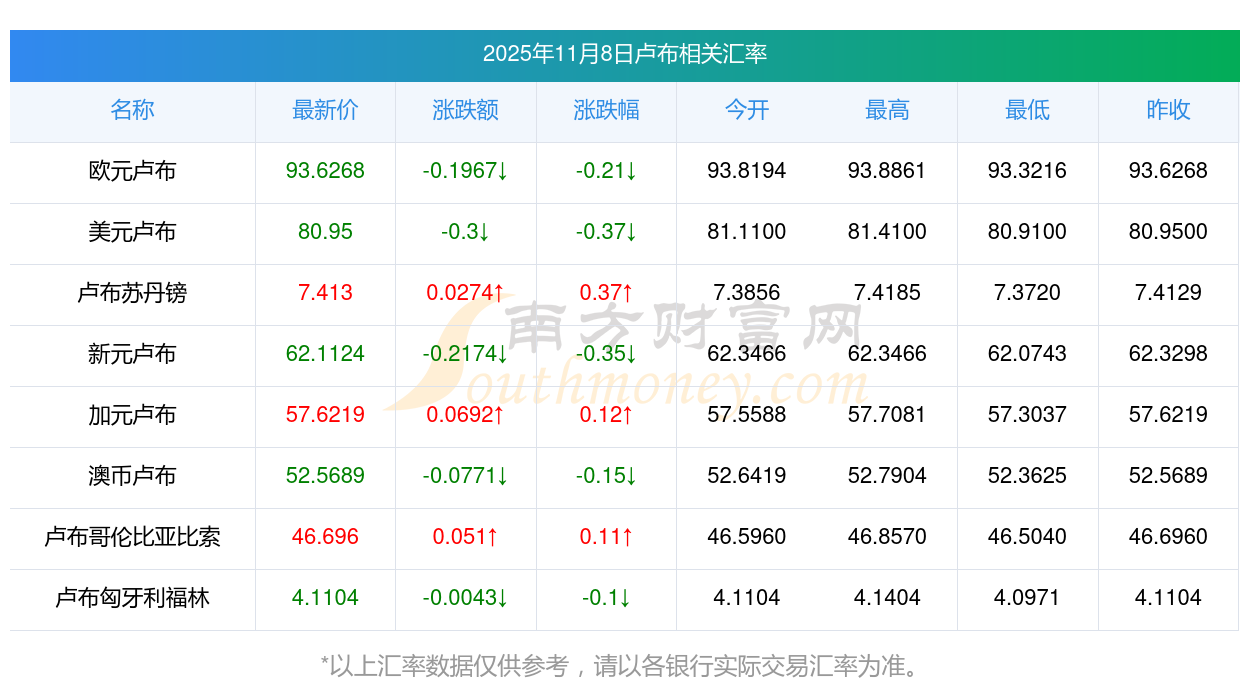 2025年11月8日盧布相關匯率查詢