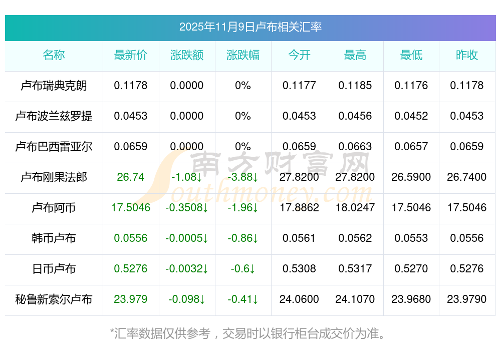 2025年11月9日最新消息,盧布兌換阿幣最新匯率為17.504634,今開為17.8862,昨收為17.5046,最高為18.0247,最低為17.5046。
