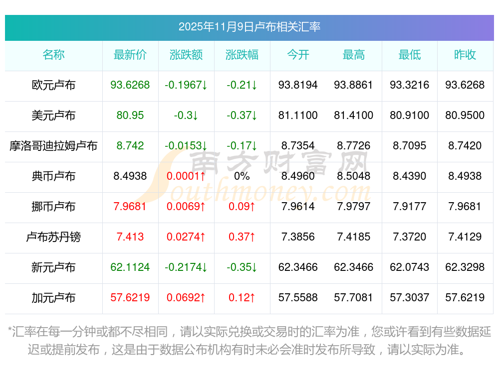 2025年11月9日盧布兌換利幣最新匯率:2.260700,今開:2.2607,昨收:2.2607,最高:2.2607,最低:2.2430。