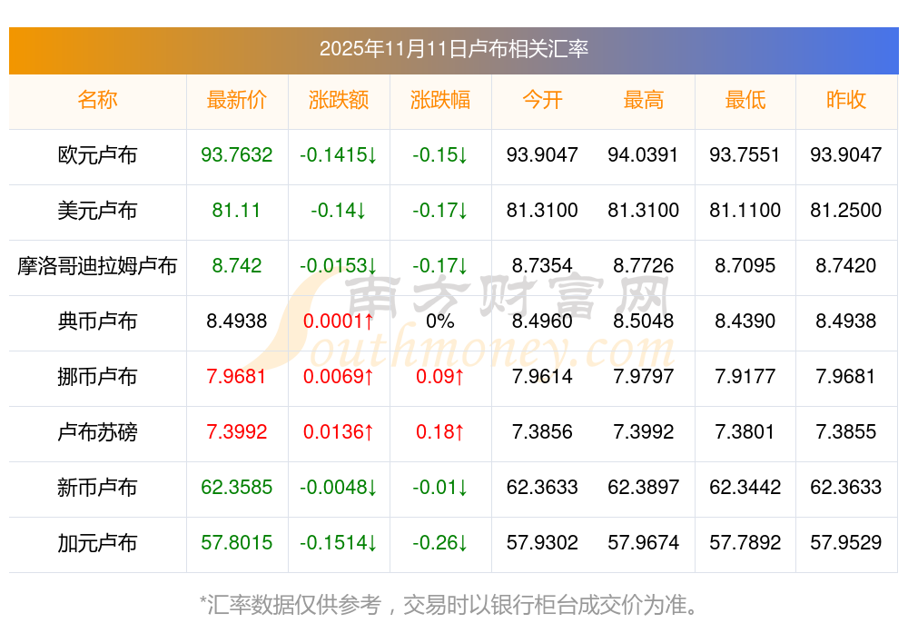 根據(jù)2025年11月11日匯率,盧布兌換美金匯率最新0.012299,今開(kāi)0.0123,昨收0.0123,最高0.0123,最低0.0123。