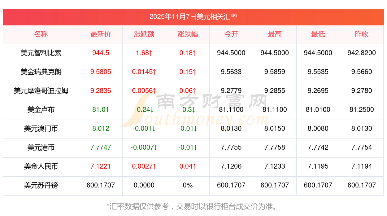 根據(jù)2025年11月7日匯率計(jì)算,USD兌換MOP匯率最新價(jià)8.012000:今開價(jià)8.0130,昨收價(jià)8.0130,最高價(jià)8.0150,最低價(jià)8.0080。