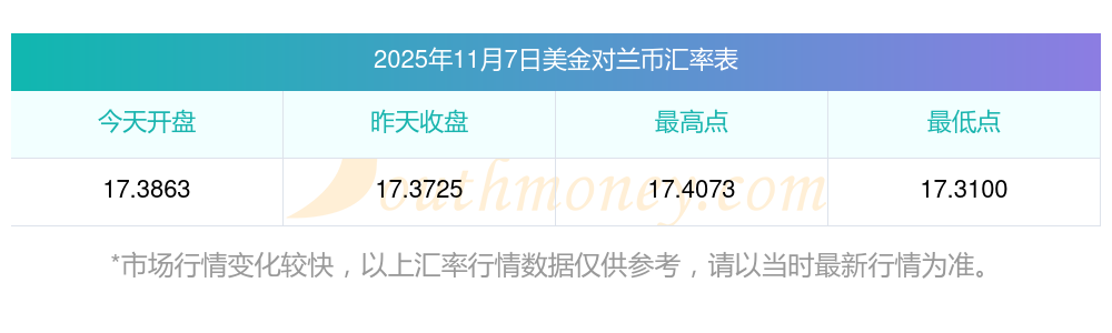 2025年11月7日美金與蘭幣的兌換匯率計(jì)算如下: