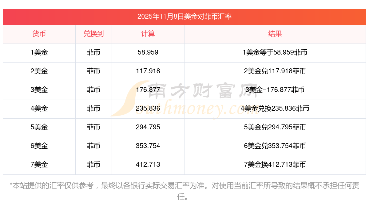 貨幣兌換 | 將美金轉(zhuǎn)換菲幣匯率計(jì)算表? 2025/11/8