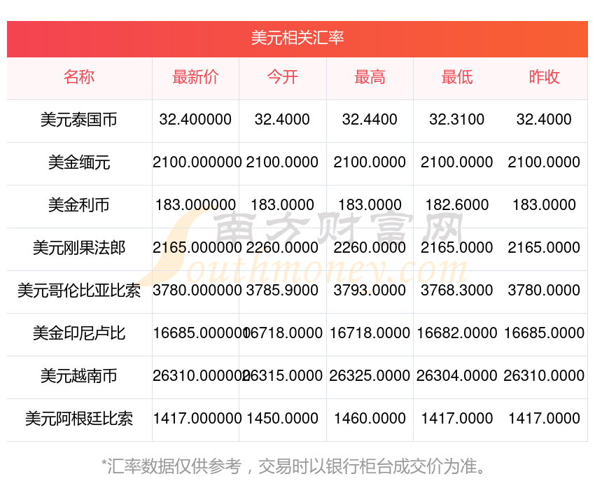 匯率在每一分鐘或都不盡相同,請以實際兌換或交易時的匯率為準,您或許看到有些數(shù)據(jù)延遲或提前發(fā)布,這是由于數(shù)據(jù)公布機構有時未必會準時發(fā)布所導致,請以實際為準。