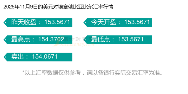 2025年11月9日美元兌換埃塞俄比亞比爾匯率是:153.5671