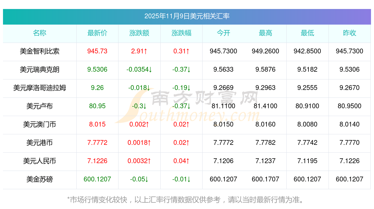 根據2025年11月9日匯率計算,USD兌換MAD匯率最新價9.260000:今日開價9.2669,昨日收價9.2670,最高價9.2963,最低價9.2555。