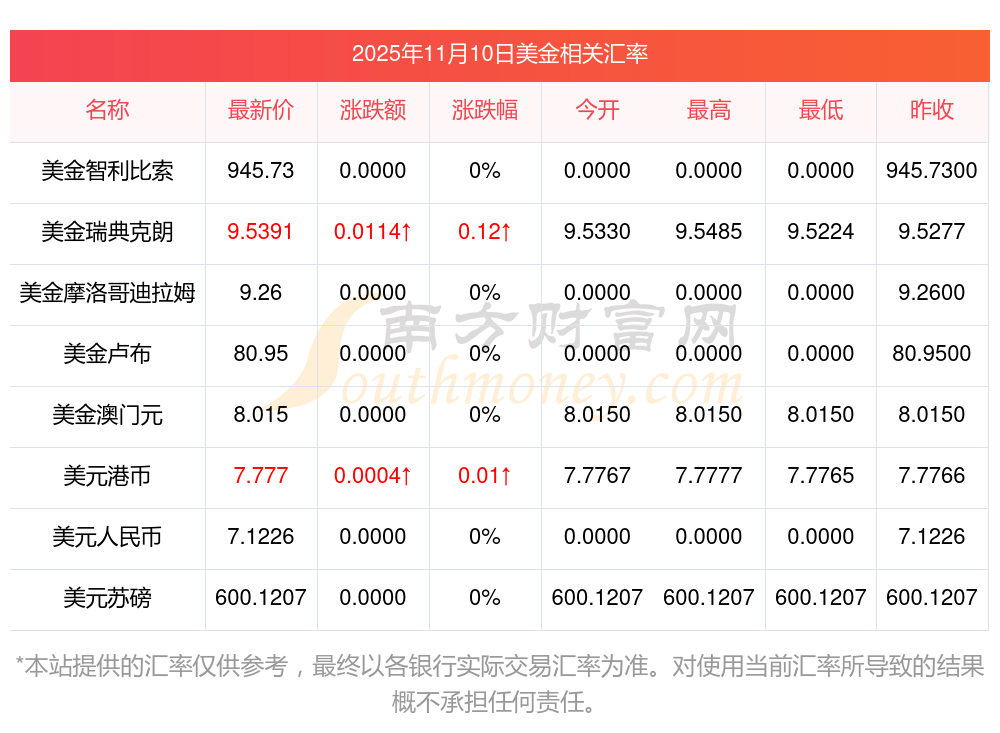 2025年11月10日美金相關(guān)匯率查詢