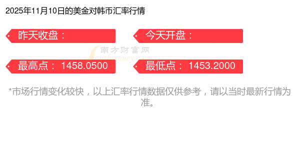 今天匯率行情:1美元兌韓元匯率表(2025-11-10)