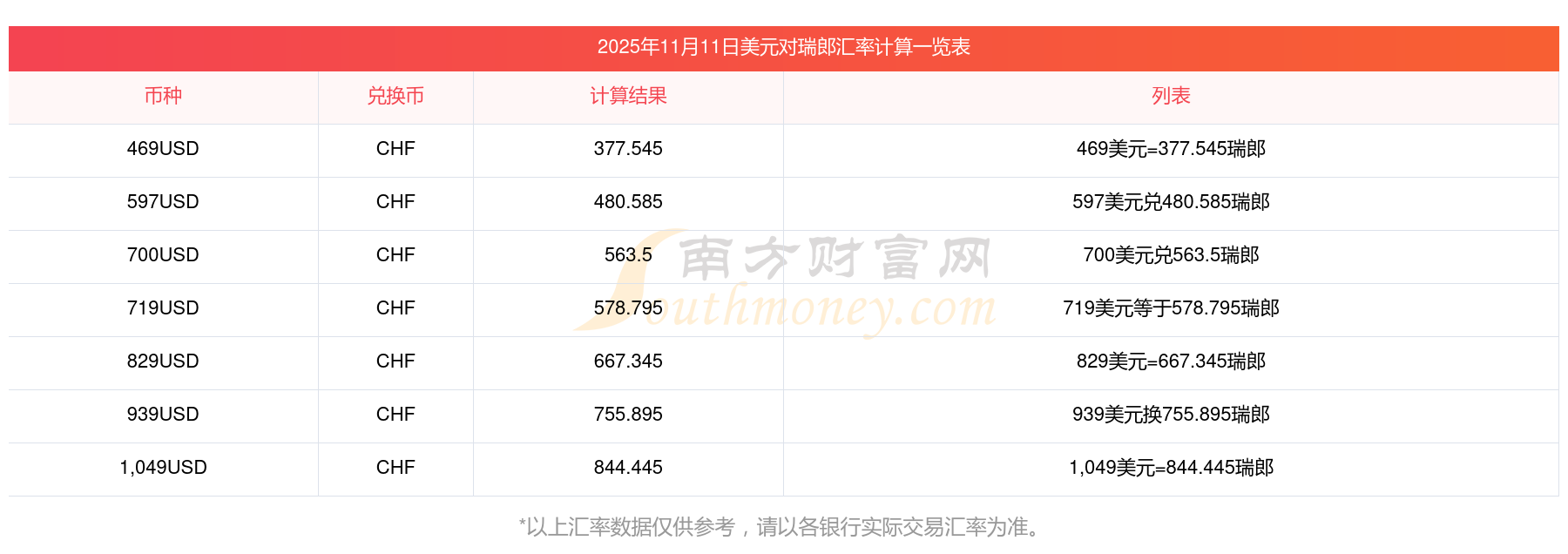 2025年11月11日美元與瑞郎的兌換匯率計算如下: