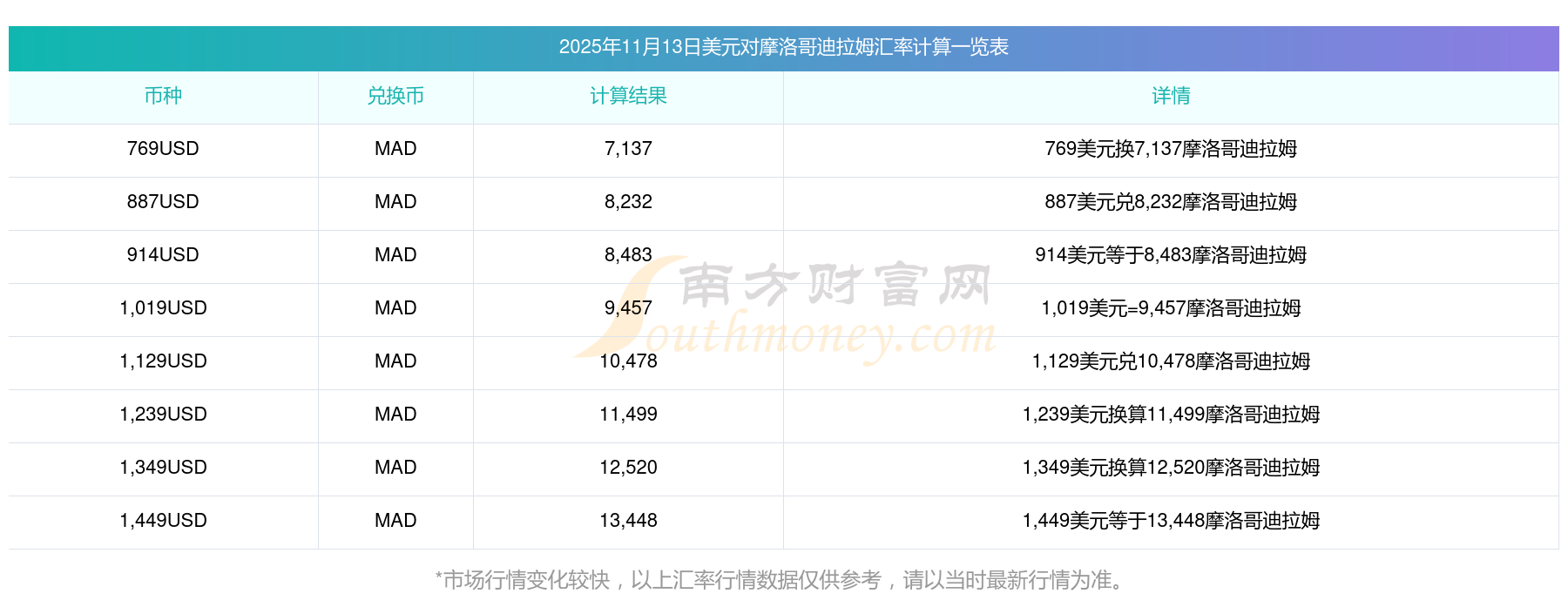 今日匯率計(jì)算:13美元:120.6543摩洛哥迪拉姆