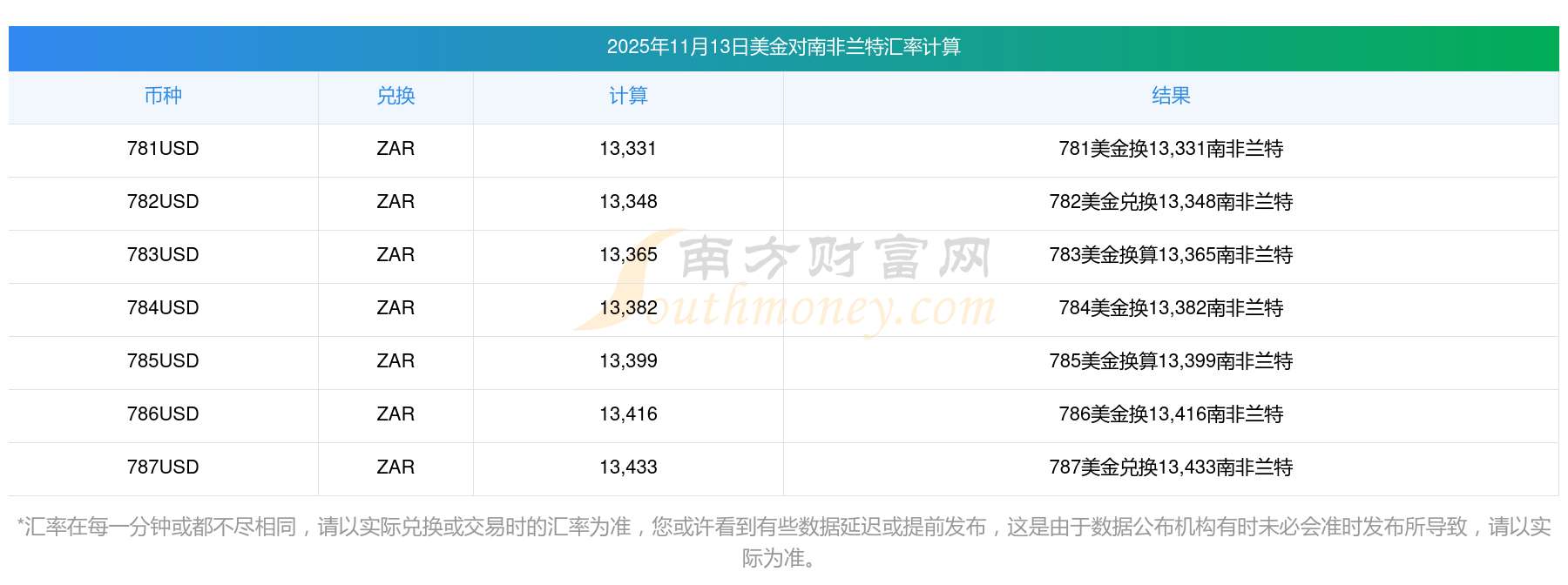 2025年11月13日貨幣兌換:10美金=17.0689南非蘭特。舉例:假如一塊面包需要10美金,則需南非蘭特:17.0689南非蘭特。