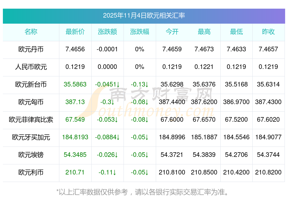 根據(jù)2025年11月4日匯率,歐元兌換新臺幣匯率最新價35.586300,今開價35.6298,昨收價35.6314,最高價35.6376,最低價35.5168。