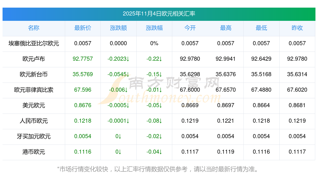 根據(jù)2025年11月4日匯率,歐元兌換蘇磅匯率最新691.580000,今開691.4300,昨收691.4600,最高691.8800,最低690.1300。